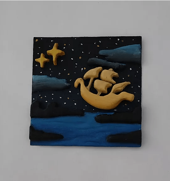 This piece was created my junior year of high school in my Ceramics and Sculpture class. The project was to create a unique scene by cutting into a block of balsa foam and then paint it. I saw a drawing made of a ship sailing through the sky to Neverland and the world of Peter Pan and decided to base it off that. This was one of the first projects I made in class that dealt with 3-D designs and carvings so I found it very fun. I believe 3-D projects is where I can do my best work so it was really fun to play around with this and make something I really enjoyed. The biggest challenge was painting the sculpture because it was very uneven and I had to create multiple ombre looks to create shadows and depth which was difficult but I think it ended up being successful and came out as a good piece of work.
