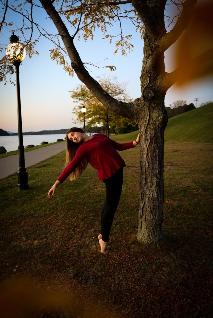 The next picture I would like to discuss is actually a picture of my sister. She runs an account on Instagram for all the dance and yoga that she does so she asked me to take a few pictures of her for her account. We went down by the river and started taking photos. I started playing around with different concepts, poses, and locations. As you can see in this picture, there is this orange blur on the edges. To do this I took a branch with some leaves on the end and dangled it in front of the camera. This creates a blurred effect and, I think, helps make it look more three-dimensional. I edited this photo so it would give off a nice warm glow. The color of the leaves, her shirt, and even some of the grass has a nice, warm tint. I decided to use that to my advantage and enhanced it to really bring the picture to life. I also like the pose my sister is doing because it utilizes the tree so it is not just her in an empty frame and it really goes with the vibe of the picture. From my perspective, it looks like she is bringing attention to the time of year by the way she is reaching towards the ground and how her hair is falling. To me this resembles leaves falling off the trees. I also think the blurred leaves on the edges help push that idea. This picture reminds me of the little ballet figurines in music boxes hence the title. This was a very fun shoot I got to do with my sister and it was actually the first real photo shoot I have ever done. It was very new but exciting and we got some really great pictures out of it so I look forward to doing it again.